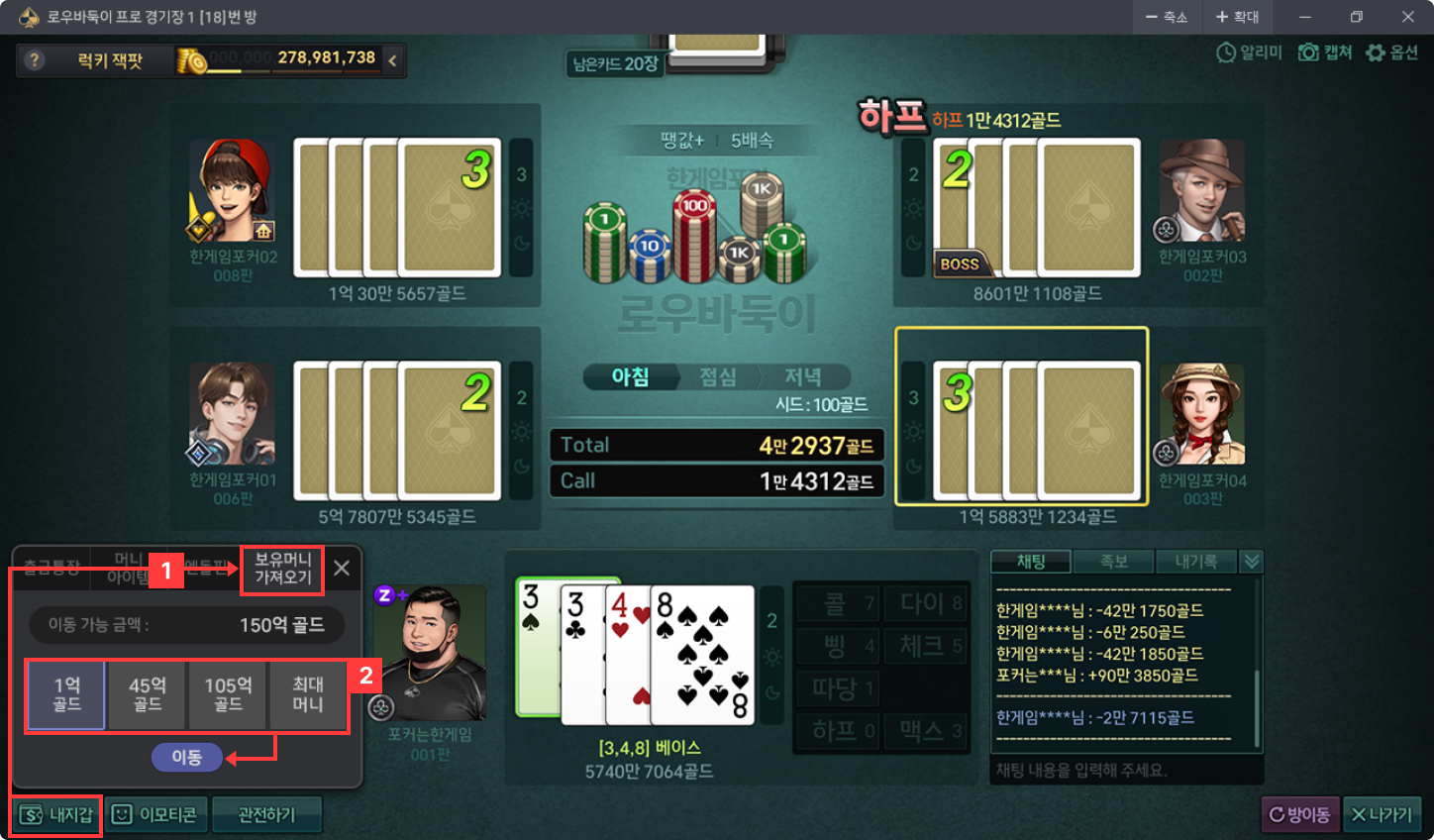 - 게임룸에서 보유머니를 가져올 경우, 보유머니가 많은 계정부터 보유한도 내 억단위로 합산하여 이동합니다.