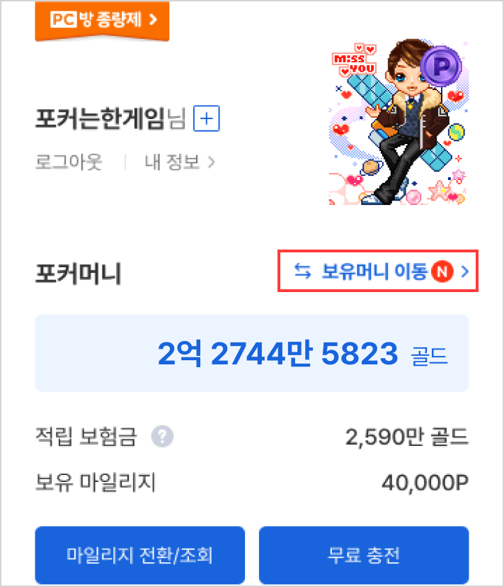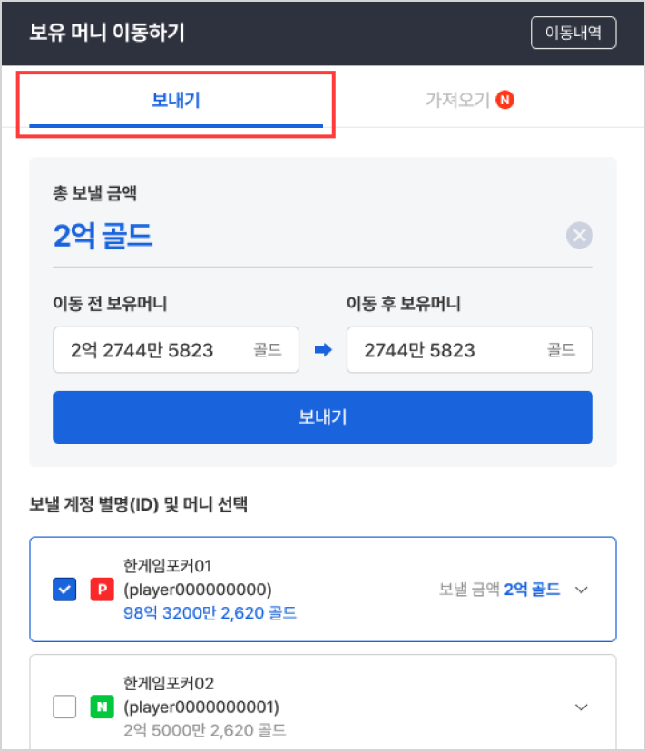 - 보내기 : 동일 주민번호 내 다른 계정으로 보유머니를 보낼 수 있습니다.