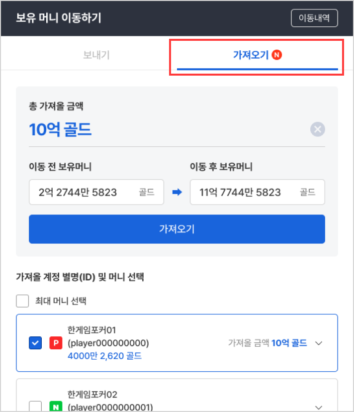 - 가져오기 : 동일 주민번호 내 다른 계정에서 보유머니를 가져올 수 있습니다.