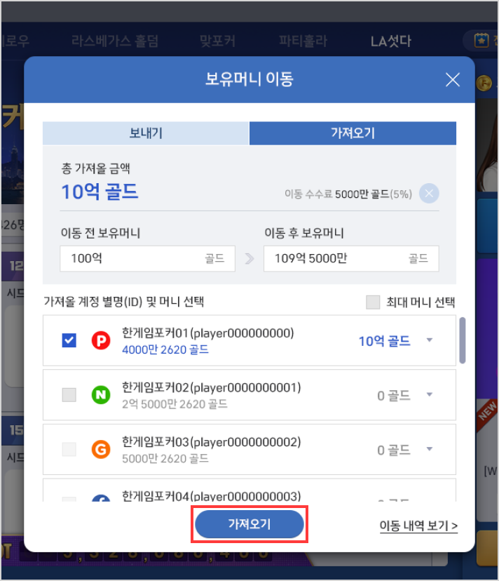 - 최대 머니 선택 : 보유한도 내에서 나의 계정별로 가져올 수 있는 최대 머니를 보유머니 많은 계정부터 자동으로 선택합니다.