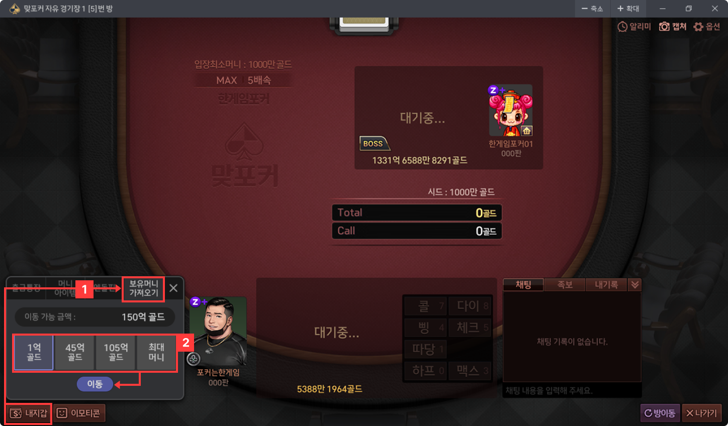 - 게임룸에서 보유머니를 가져올 경우, 보유머니가 많은 계정부터 보유한도 내 억단위로 합산하여 이동합니다.