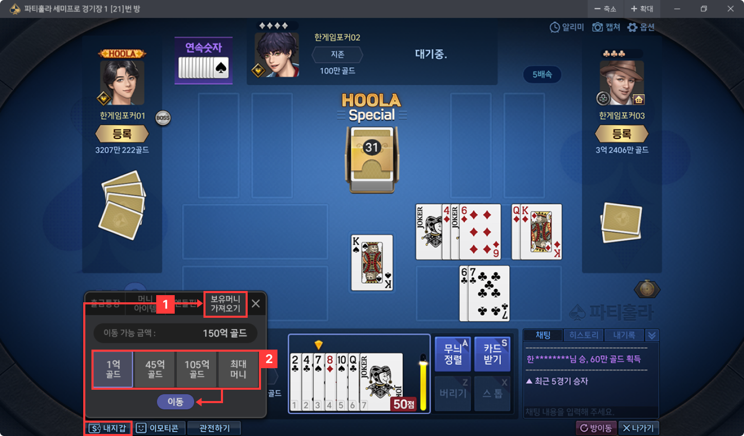 - 게임룸에서 보유머니를 가져올 경우, 보유머니가 많은 계정부터 보유한도 내 억단위로 합산하여 이동합니다.