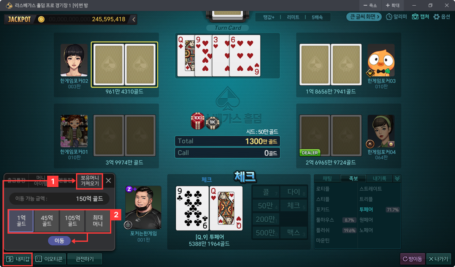 - 게임룸에서 보유머니를 가져올 경우, 보유머니가 많은 계정부터 보유한도 내 억단위로 합산하여 이동합니다.