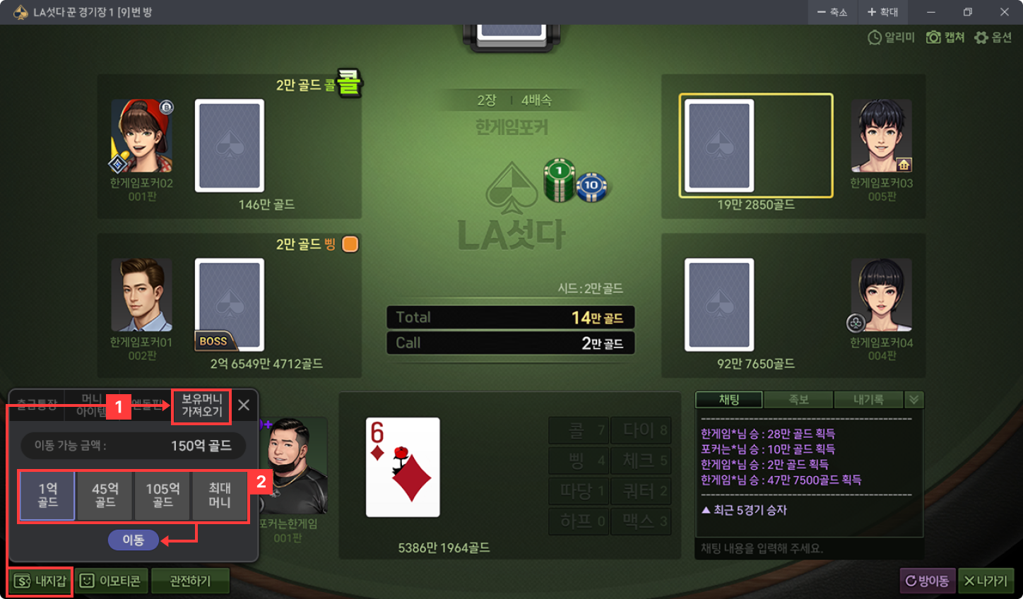 - 게임룸에서 보유머니를 가져올 경우, 보유머니가 많은 계정부터 보유한도 내 억단위로 합산하여 이동합니다.