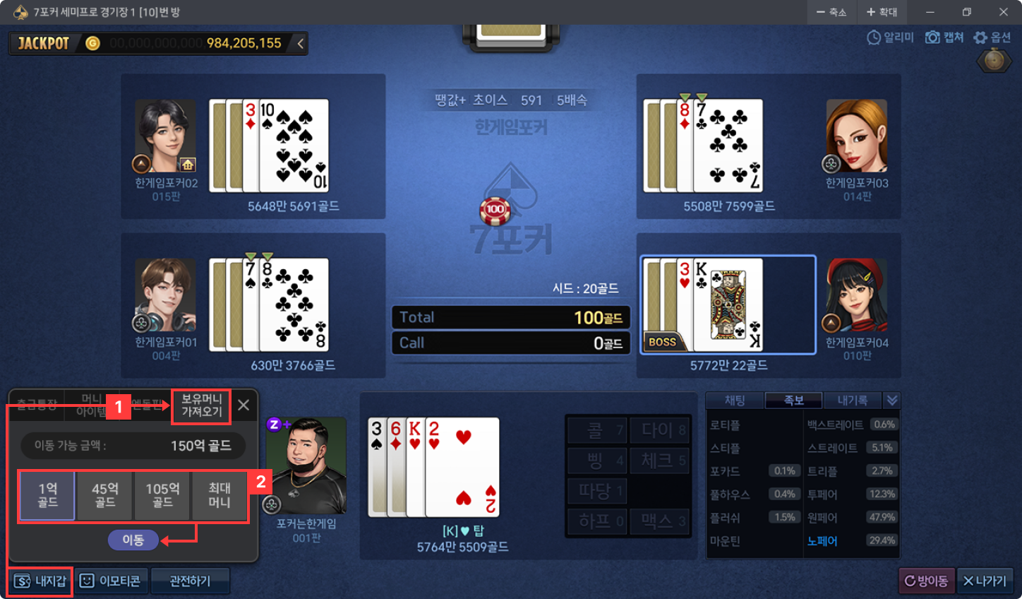 - 게임룸에서 보유머니를 가져올 경우, 보유머니가 많은 계정부터 보유한도 내 억단위로 합산하여 이동합니다.